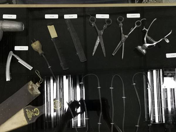 展示的許多的理髮工具現在都已經看不到了。就左上角的耐力牌吹風機在我國小時候,曾經稱霸全台理髮廳。左下角很像皮帶的則是磨刀帶。