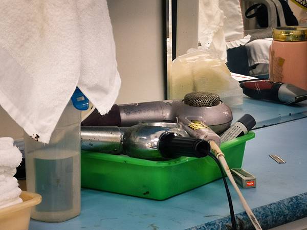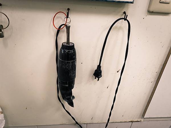 當我以為這些理髮用品只是店家收藏的回憶品時,無意間撇到桌子上擺放著的理髮器及耐力牌吹風機,我瞬間嚇一大跳。