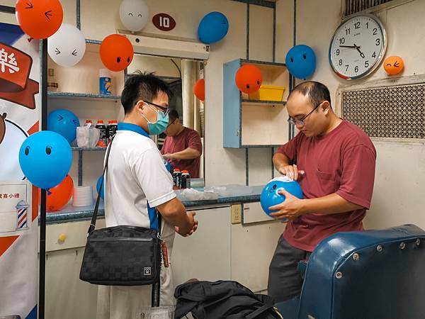 整間理髮廳空間並不大,走到底就是讓民眾體驗氣球刮鬍的地方。服務人員很熟練的在氣球上塗滿刮鬍泡沫。