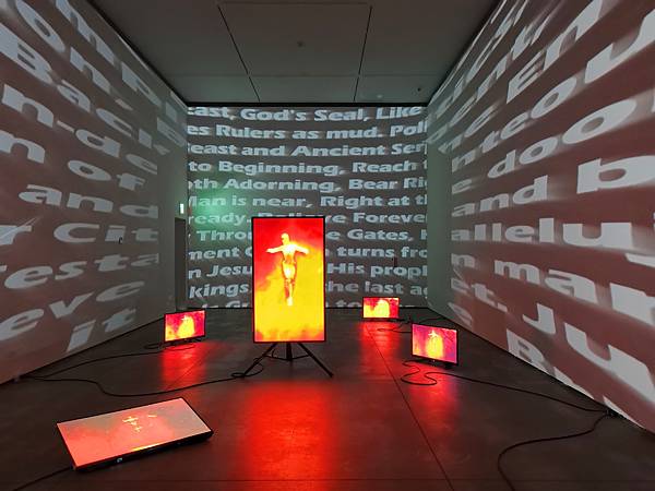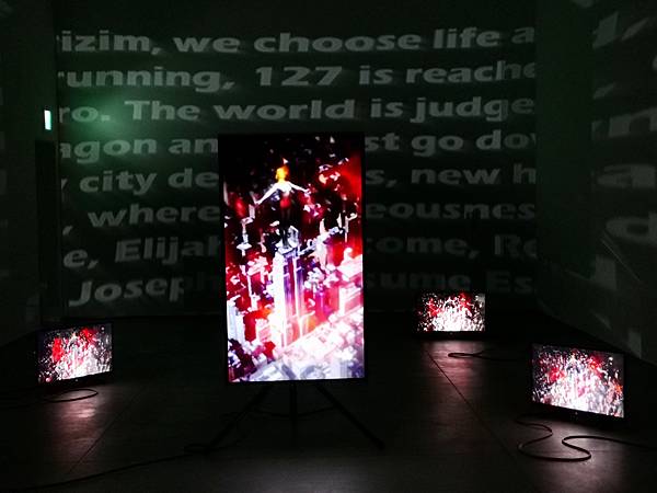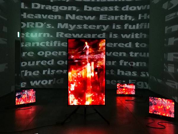 【夏娃克隆創造計畫3】的展區,林珮淳將聖經【但以理書】、【啟示錄】的章節,以數位影像溶接技術將文字充斥在整個空間之中。大而粗黑的的字體影片緩緩向外流動,並逐漸擴大且發出放射光影,配上帶有神聖的數位背景音樂,一種超越畫框的沉浸式空間衍然成形。