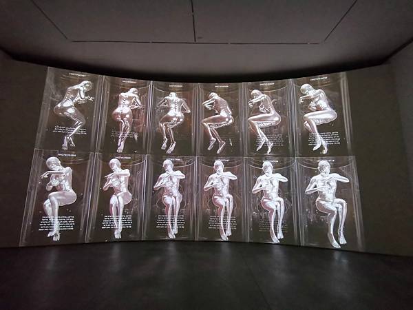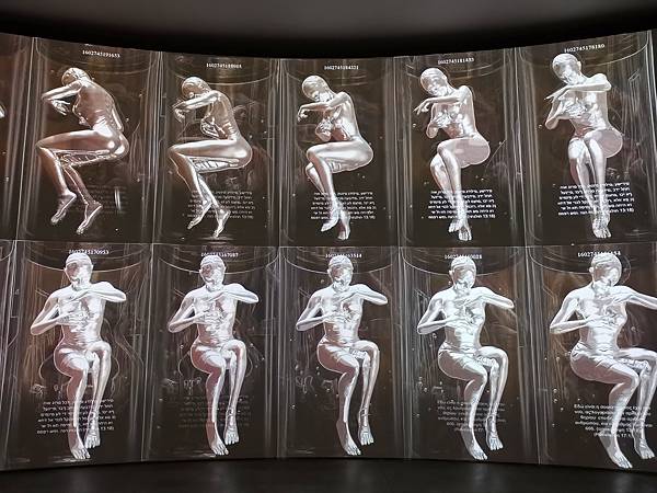 一進到展區就可以看到牆上一尊尊排列成曲面投影的「夏娃克隆」形體,呈現如素描的灰色色調且靜止不動。