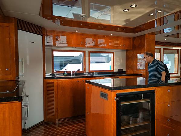 進到遊艇內部,居然有廚房和餐桌,烹飪器具、冰箱、鍋碗瓢盆一應俱全,而且內部空間都不輸我家廚房了