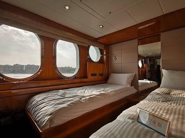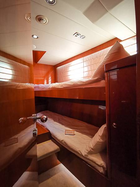 下到船艙裡面二間臥房,分別擺放著二張單人床。要在船上小瞇一下或過夜都沒有問題。