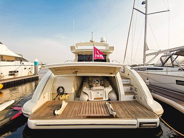 這台更屌,快艇停放在遊艇的內部空間,需要使用的使用才拿出來。完全不影響到後方空間的使用。