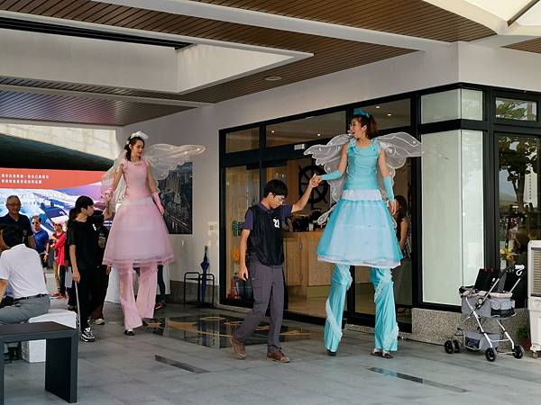再往前方走去,看到工作人員扶著踩高蹺的街頭藝人前往對面和民眾拍照。