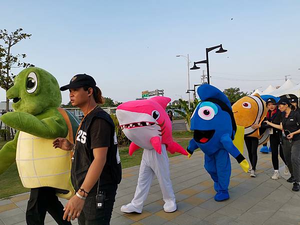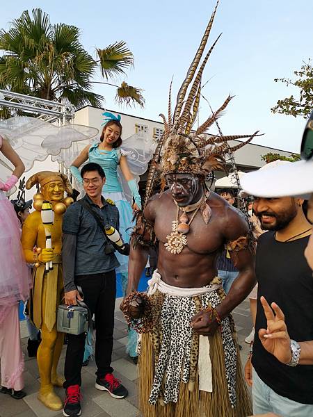 海洋人物遊行Show的隊伍,這時也走至定位。工作人員已經開始引導想要和他們合拍的民眾隊伍。