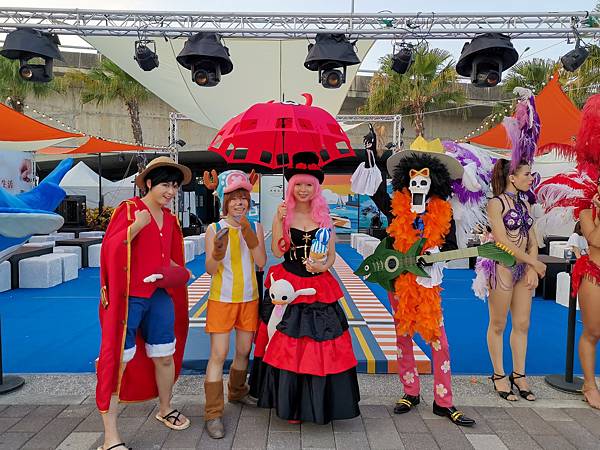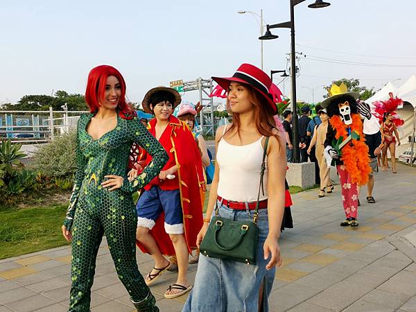 除了海龜、鯊魚、小丑魚之類的海洋生物,後面緊跟著是水行俠男女主角及海賊王角色的cosplay。