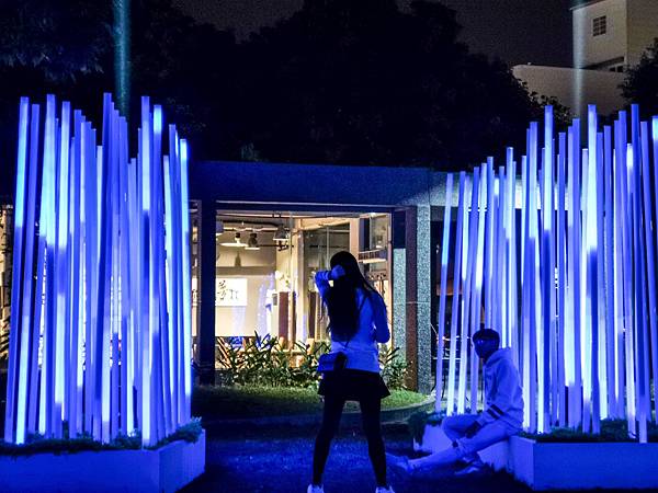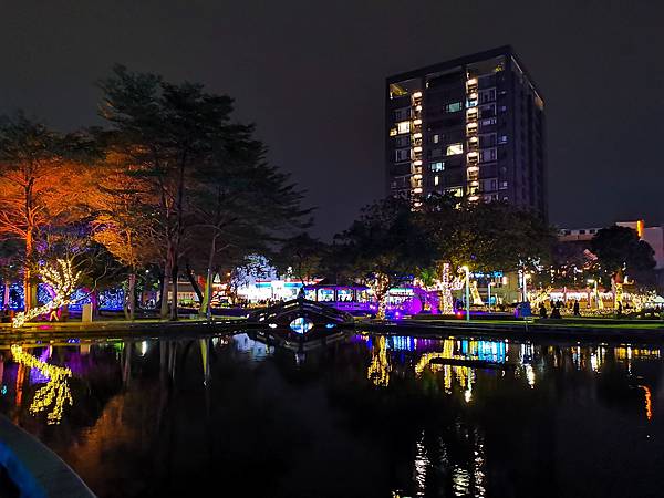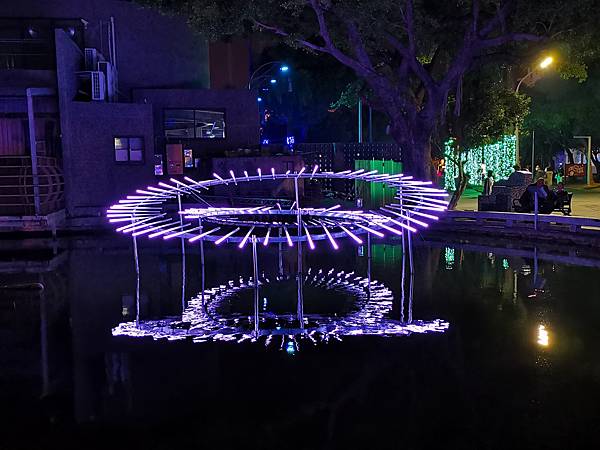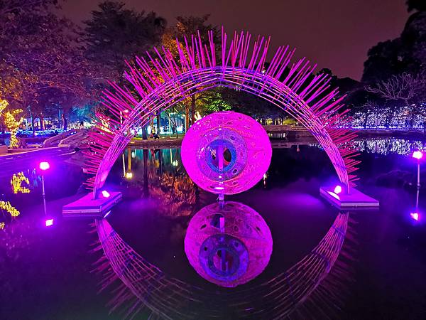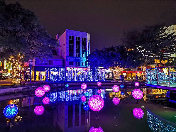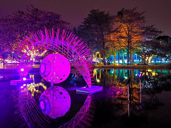 除了十大藝術燈飾之外,屏東公園讓我覺得相當浪漫的場景,莫屬於在「PINGTUNG」燈飾後方的水岸邊,湖面在燈飾的襯托下,更顯絢爛多采。