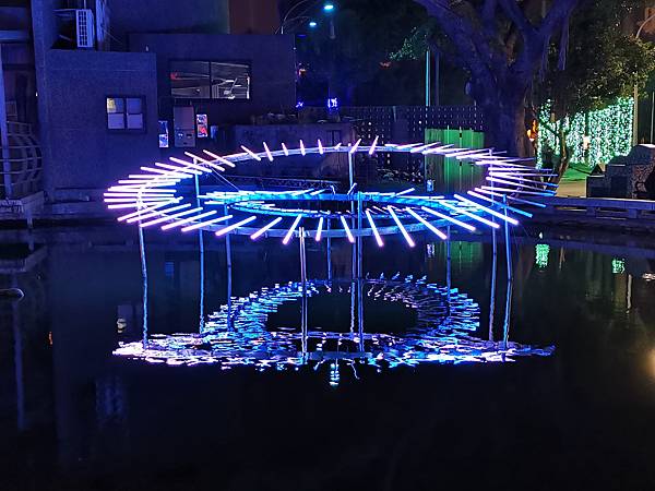 「追光而行」在湖上透過內外環狀排列的燈管,閃耀著繽紛耀眼的光芒,在不同的律動下,與湖面相互輝映,帶給民眾極佳的視覺饗宴。