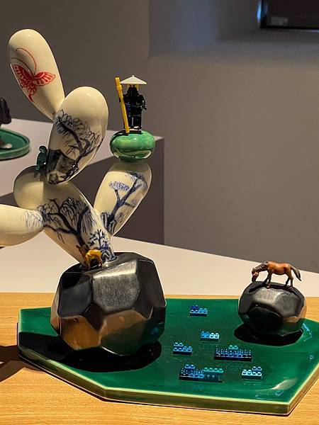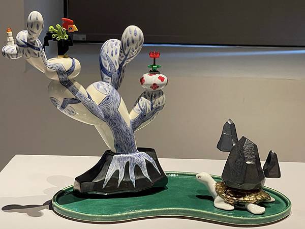 《馬鹿風景》與《金龜山與樹》是我相當喜歡的創作,陶瓷作品與其上的山水畫,帶人進入如夢似幻的意境之中,當你欲細品之時,擺設的玩具積木,瞬間把你拉回現實,讓人不禁莞爾一笑,卻不給人突兀的感覺。
