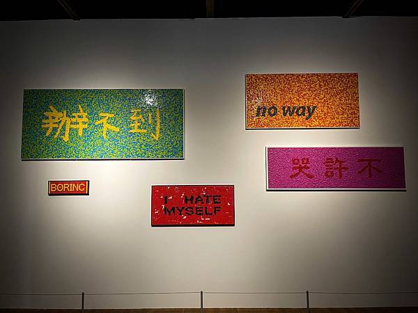 《辦不到》、《BORING》、《I HATE MYSELF》、《no way》、《不許哭》這些分別使用中、英文字寫成的短促卻強而有力的標語,是作者呈現當代人對於生活的壓力和負面情緒,使用充滿歡樂形象的樂高堆疊而成,讓人感覺格外的諷刺。