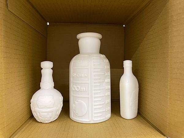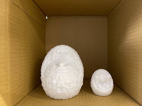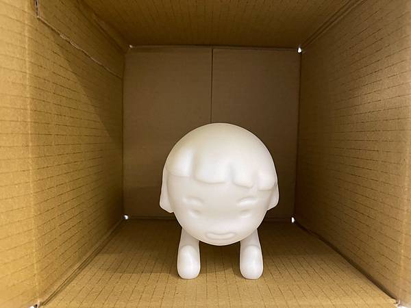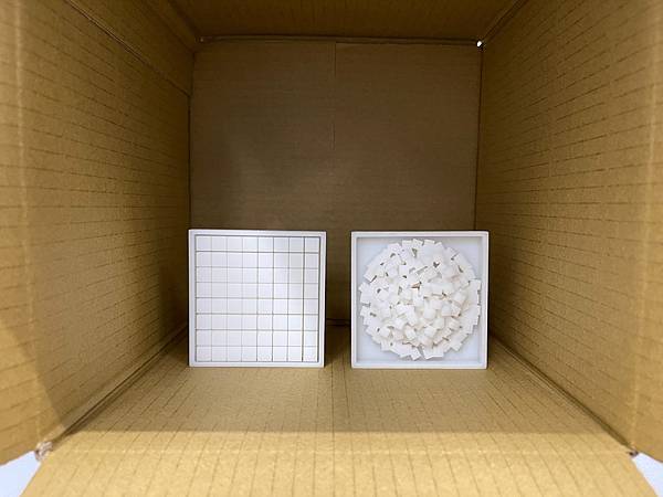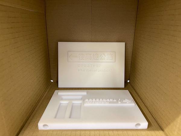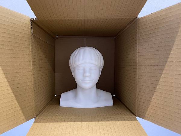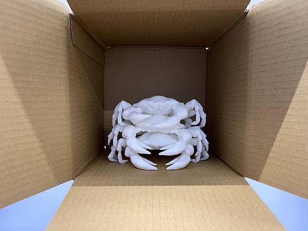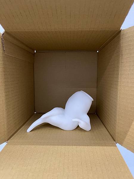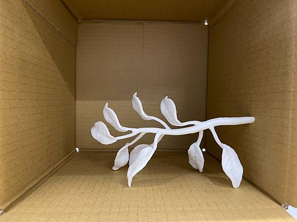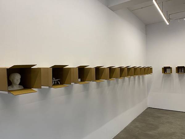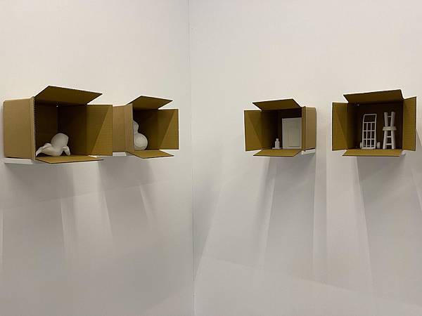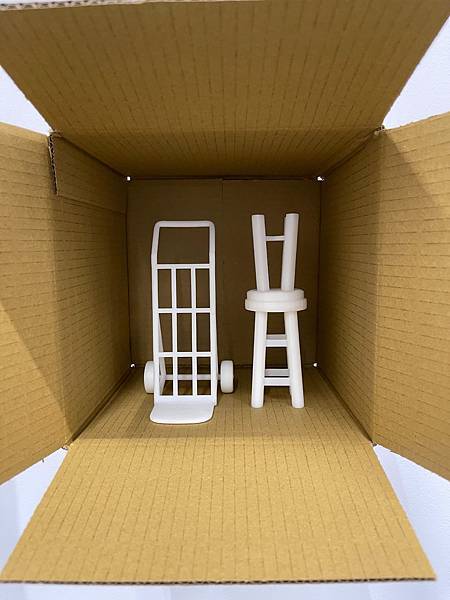 接下來的作品《雕塑20招》,是由眼前20個瓦楞紙箱裡面未經著色的3D列印原型所組成的作品。