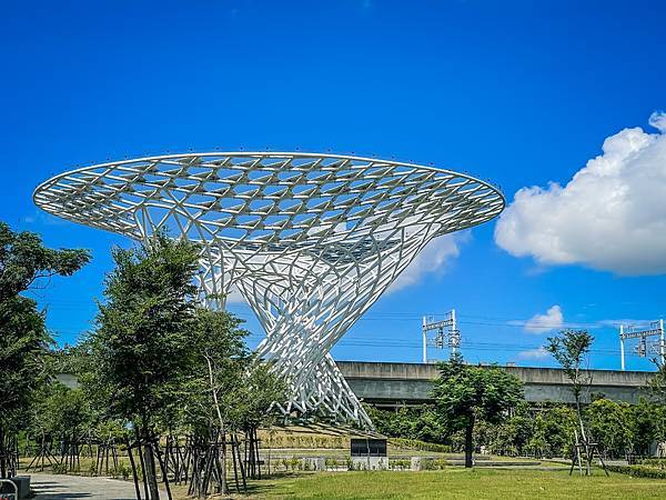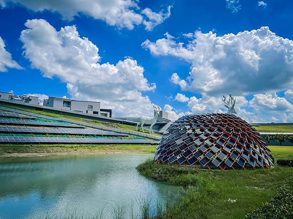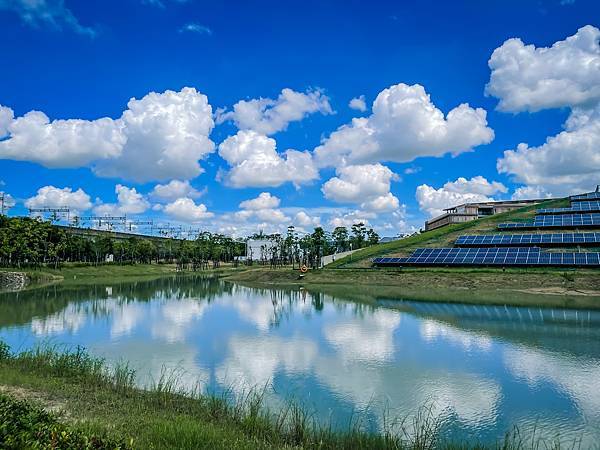 太陽能樹旁有一個小湖泊,天氣清朗時,藍天白雲倒映在水面上,畫面純淨唯美,令人驚艷不己。