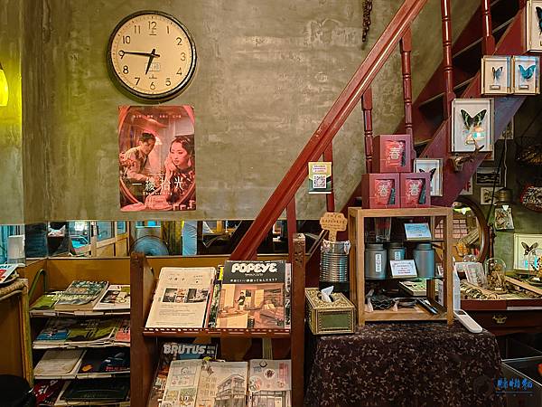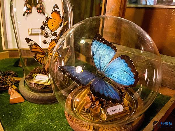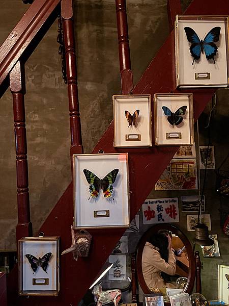 樓梯下擺設著老闆的收藏品,當中有蝴蝶標本及手繪,其中最令我印象深刻就是藍色蝴蝶的標本,相當的美麗動人。