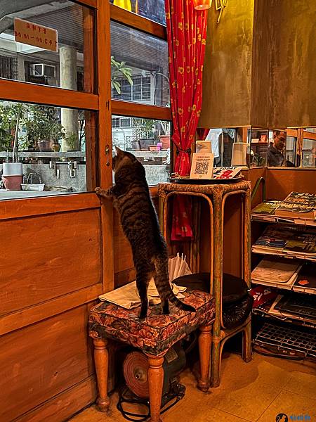 店貓麥麥站在椅子上,扶著木門,眼神癡癡地望向窗外,感覺牠很想出去呼吸一下新鮮的空氣阿。