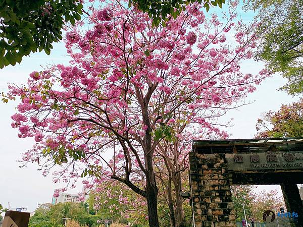 抱持著碰碰運氣的想法,前往竹溪街「健康廣場」牌坊前,觀望粉紅風鈴木是否盛開了。