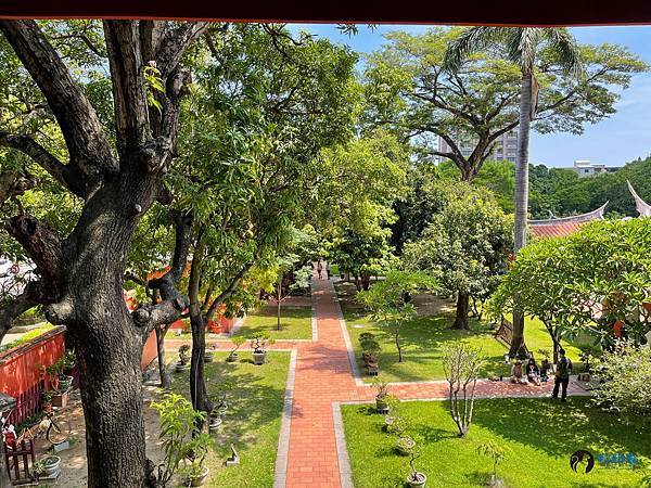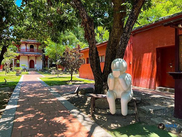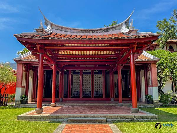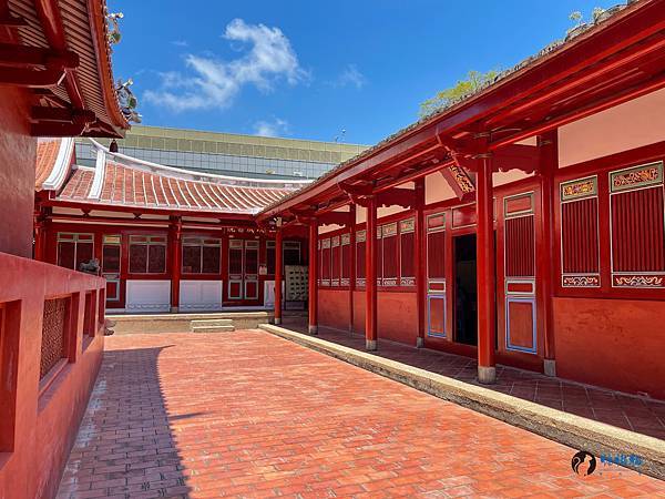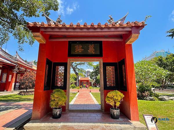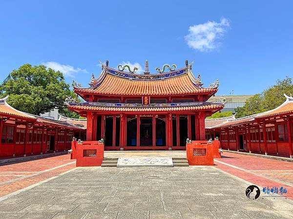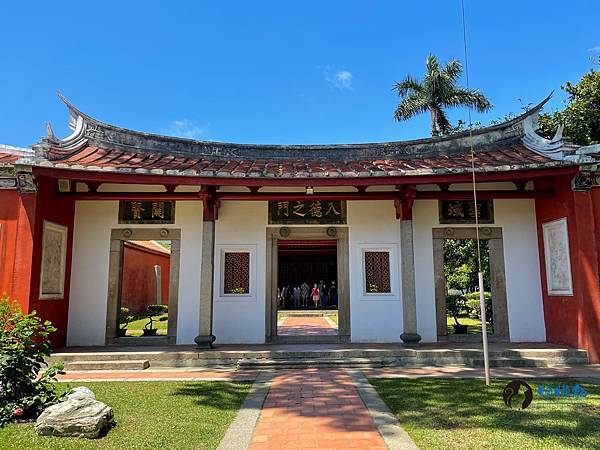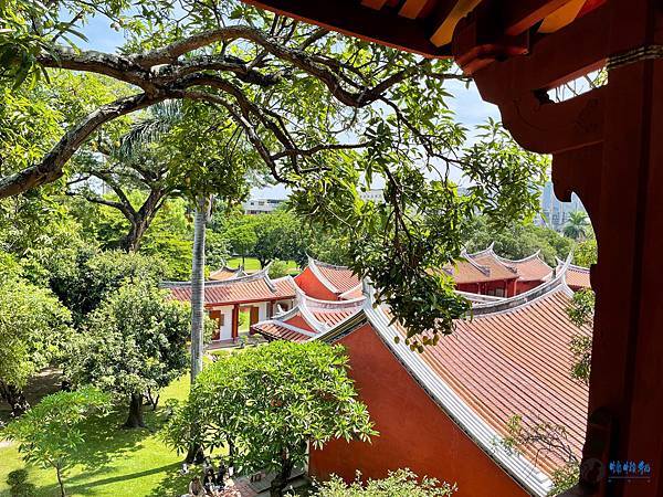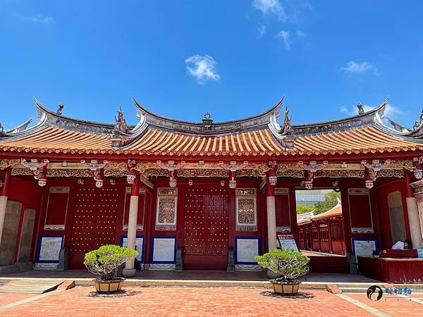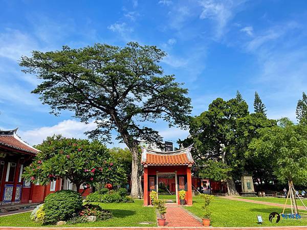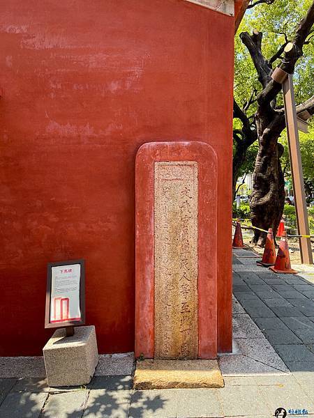 走進孔廟迎面而來的是雕工華麗的傳統台閩式建築和綠意盎然的中庭,在藍天豔陽下,別有一番風味。紅色的圍牆在艷陽下格外的顯眼,據說是從前周朝貴族宮殿冠服的顏色,代表著崇敬與高貴。旁邊顯得有點格格不入,有著日式風情的紀念碑,描述著日治時期大正6年,日本人將孔廟重新整修後,成為我們目前所熟悉的孔廟規模。
