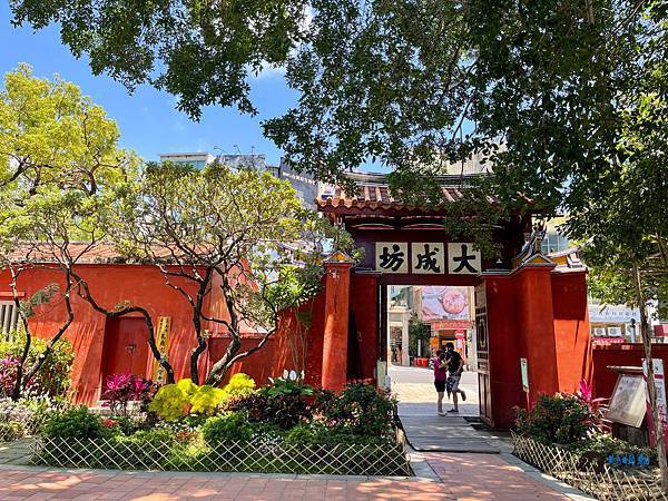 對面則是全臺灣僅有的一座「泮宮石坊」,清乾隆42年孔廟重修時才興建在東大成坊外,作為出入孔廟的主要通道。不過現在已經成為台南文創及美食的集中地,原本以為不起眼的「泮宮石坊」,經過介紹後,才知道居然有這麼多的細節可以欣賞,「泮宮石坊」是象徵地方官學的石坊,建築精神在於模仿木構建築的設計,有鴟尾雀替、瓦當滴水、飛簷等。坊頂上方的葫蘆,象徵避邪祈福的意義,石坊上也刻有「加官晉祿」、「琴棋書畫」、「翔龍瑞麟」等紋飾,皆有吉祥意涵。