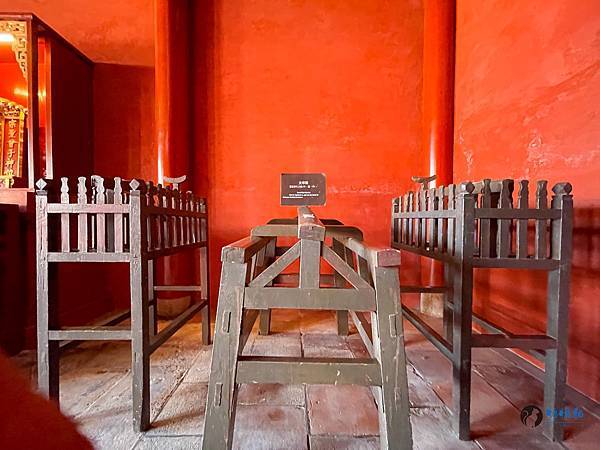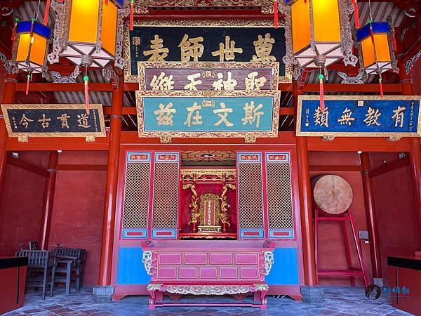 大成殿氣氛莊嚴肅穆,中央為供奉孔子的神龕,左右牆供奉四配與十二哲,孔子神龕二側可見祭孔大典放置三牲的太牢架及堂鼓。