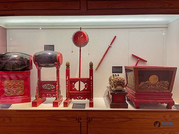 比較少見就是「敔」形狀像虎,以木雕製成,背上有齟齬(成排如齒狀的橫條突起物)二十七個。「鼗鼓」有點像波浪鼓,為起樂樂器之一。「編磬」以璧石做成,共十六枚,分上下兩層懸掛,大小不同,可發出不同音調。「柷」形狀如無蓋之紅色大箱。這些樂器都讓我相當好奇在祭孔大典的使用時機,以及它們是如何演奏。