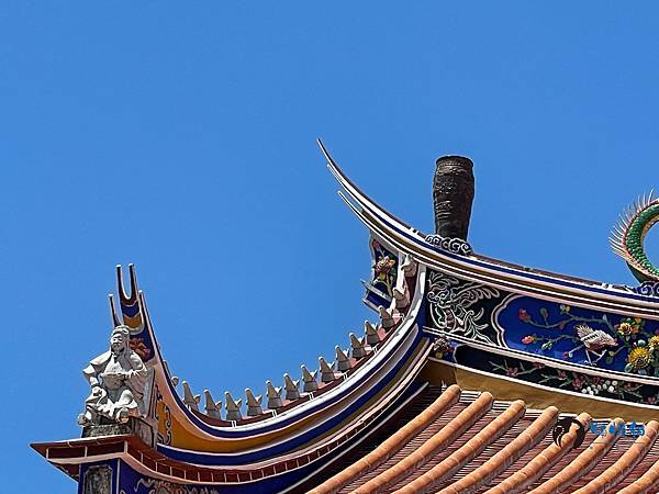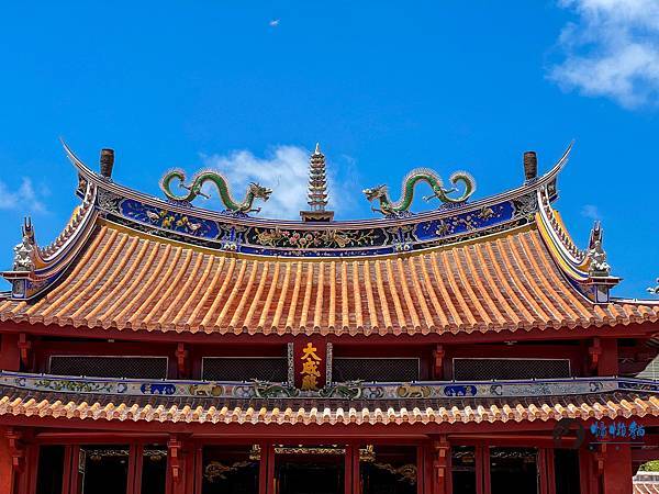 屋頂為重簷歇山頂,正脊中央有九層寶塔,象徵孔子地位崇高,兩側以雙龍護之。屋脊二側立了兩個藏經筒(通天柱),這是孔廟建築專有的裝飾,這裡就有二個典故,取名「通天柱」是朱熹認為只有孔子思想,才能上通天意。「藏經筒」則是紀念秦始皇焚書坑儒時,讀書人將經書藏於竹筒內。在垂脊上的一排小鳥,則是「鴟鴞」,比喻孔子有教無類的精神,傳說當時「鴟鴞」聽到孔子講道,而被感化從原本詩經中的惡鳥轉為馴良。