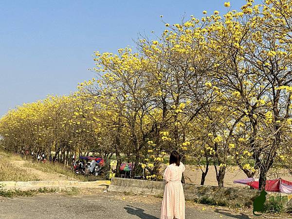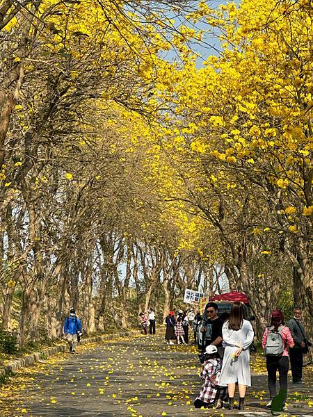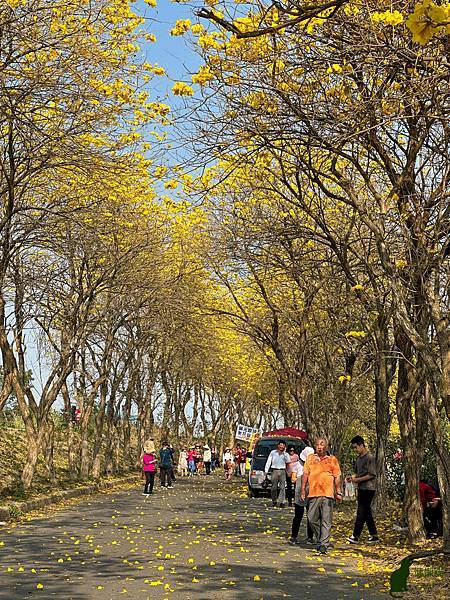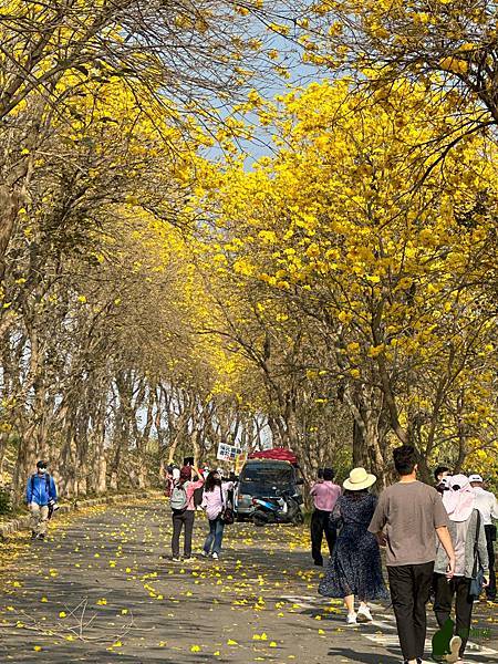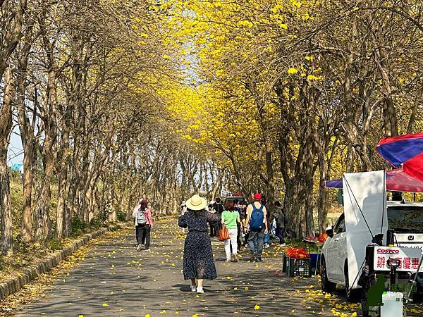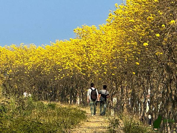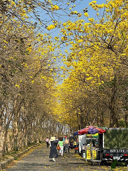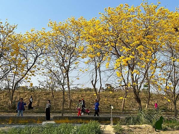 我到訪的時候,花況已開始逐漸凋落,但是看到黃花風鈴木在藍天的襯托下,閃耀著金黃色的光芒,就讓人不禁為其深深著迷,漫步在堤防下,金黃隧道綿延無盡,如此美不勝收的景緻,讓人感受到滿滿的幸福感。