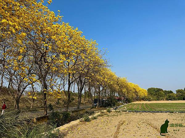 走出黃金隧道來到農田旁,眼前綿延一公里的黃金風鈴木,真的是超級壯觀,雖然和大林陳井寮的黃花風鈴木相比,可說是小巫見大巫,但還是讓人驚讚不已。看到相約出遊的老人家,紛紛在一棵黃花枝條已經垂至與人齊高的風鈴木旁留影,讓我相當羨慕他們的友情與一顆年輕的心。