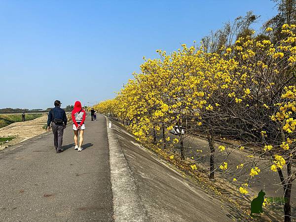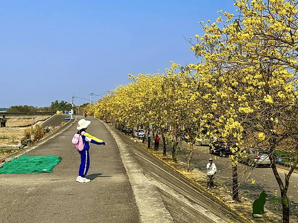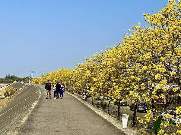 趁著藍天白雲,又適逢三月黃花風鈴木的花季,驅車來到近年嘉義新興爆紅秘境「大林陳井寮堤防」。綿延相近三公里的黃花風鈴木,猶如一條金黃色緞帶,美麗且迷人的景緻,一躍成為民眾賞花最夯的景點。