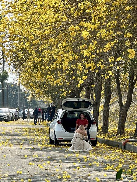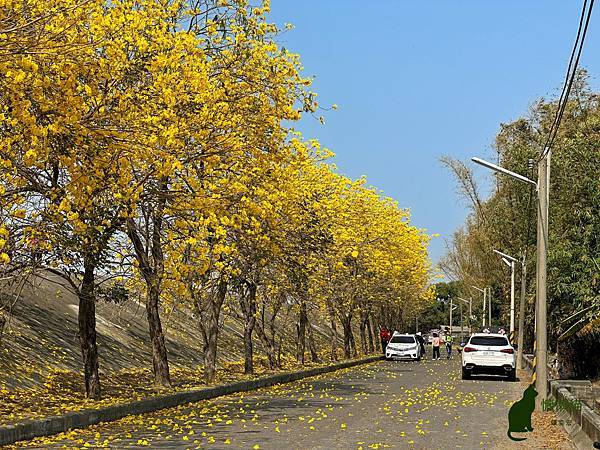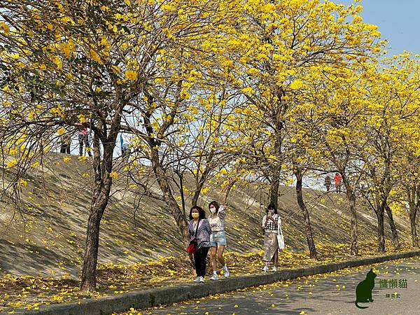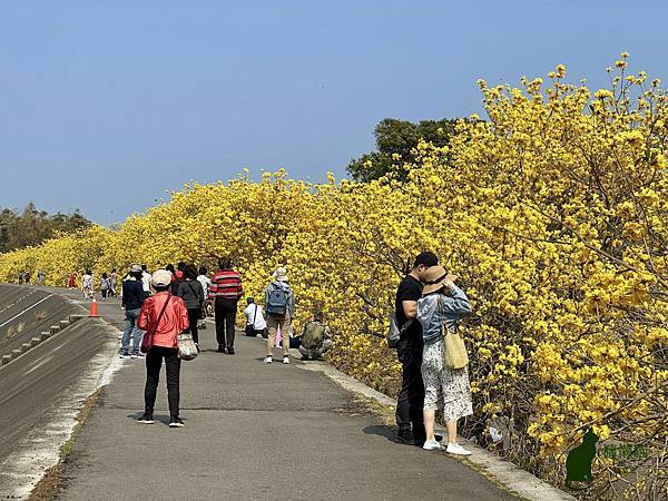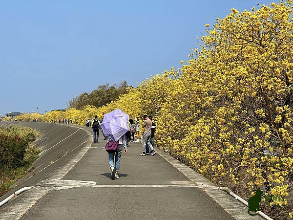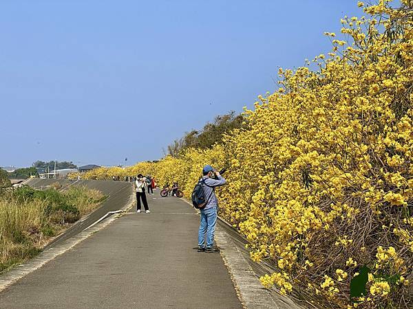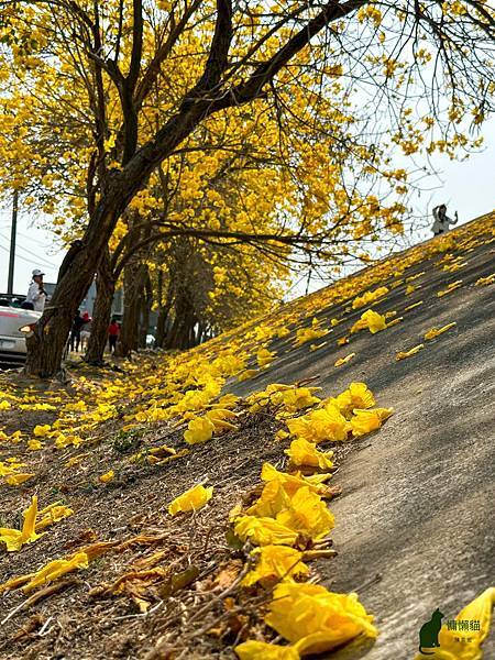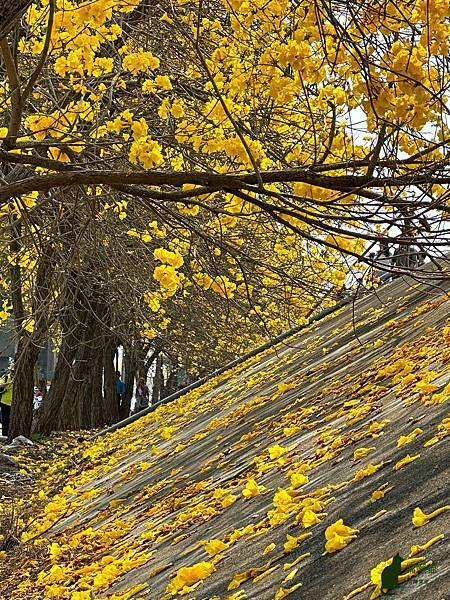 登上斜坡處,炸裂盛開的黃花風鈴木盡收眼簾,猶如一陣黃色風暴正在席捲而來。微風吹拂間,飄落的黃色花瓣將原本平淡無奇的堤防,鋪上了唯美的金黃色地毯,讓來訪的民眾都沉浸在眼前美景之中。