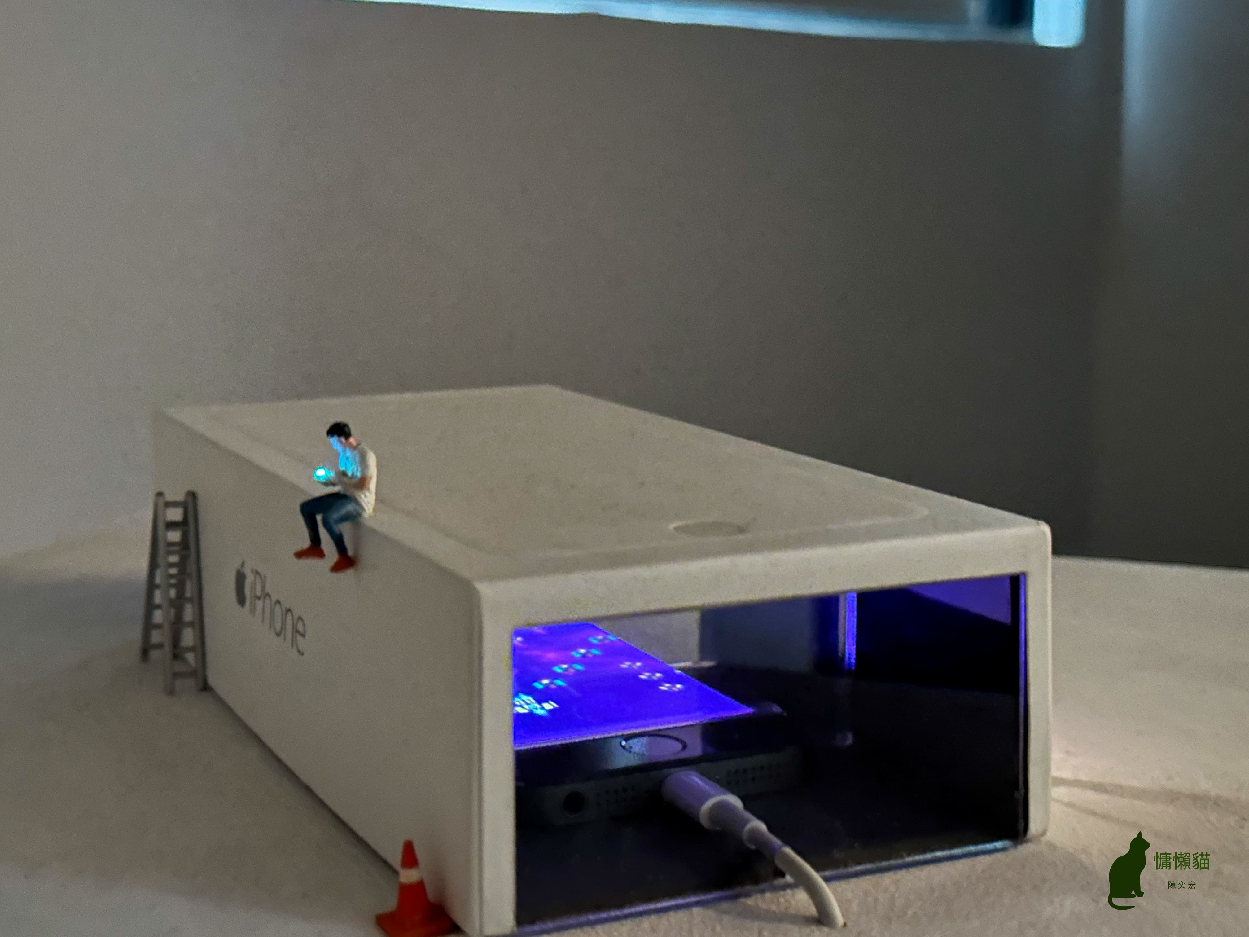IPHONE手機盒上滑著手機的人,對應著盒子裡面IPHONE螢幕上無限接收訊息的畫面。在如今資訊爆炸的時代,很多訊息真假難判,讓人難以預防。而且我們對手機的依賴程度越高,也會間接影響到我們的正常生活。