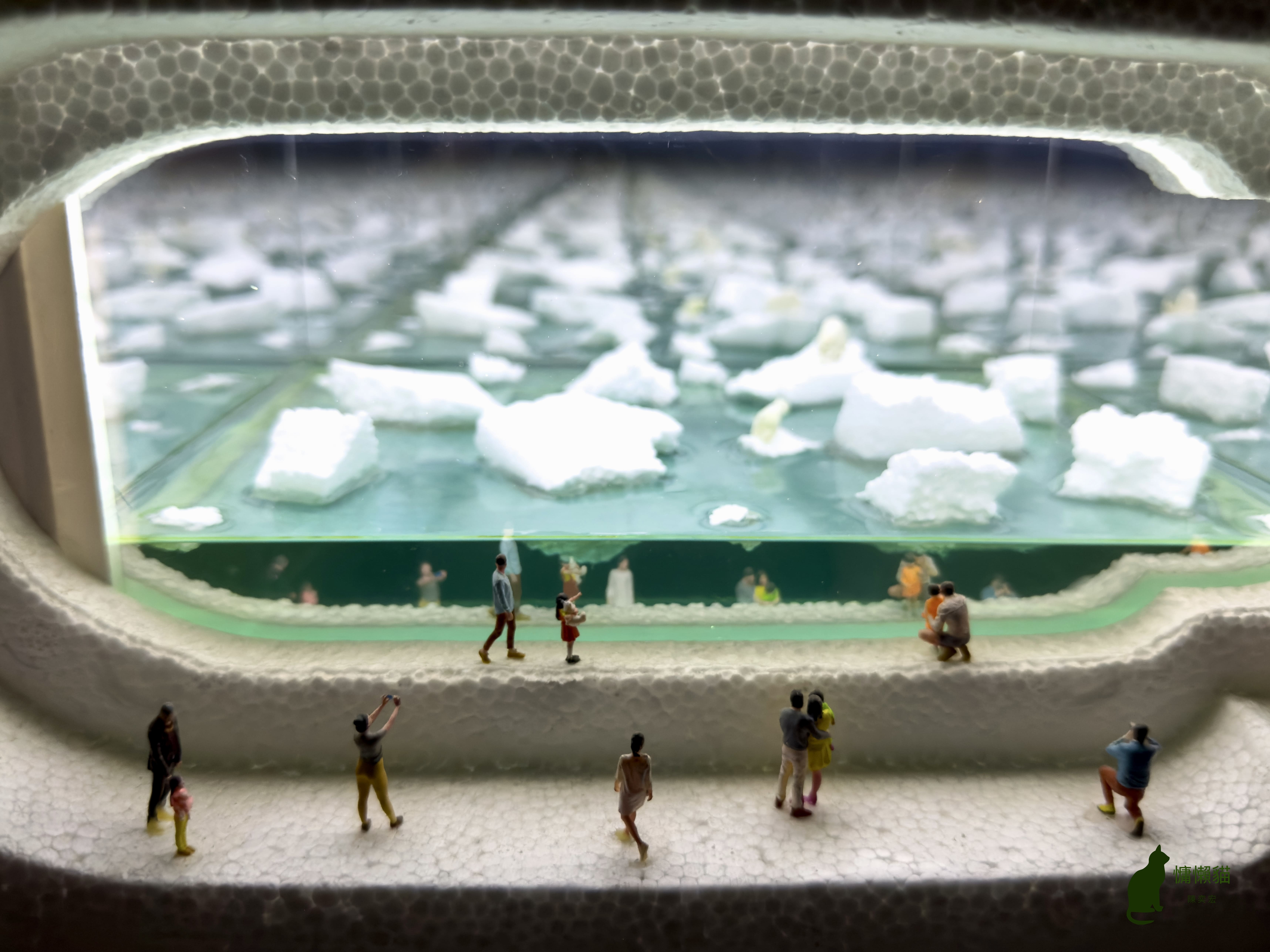 一群人們站在玻璃窗前看著動物園極地展示區裡的北極熊和企鵝,而北極熊所在的冰層已經逐漸融化漂流。正呼應著最近全球最重大的議題「全球暖和」,世界各個國家為此都開始了減碳策略,就是為了環境的永續經營。