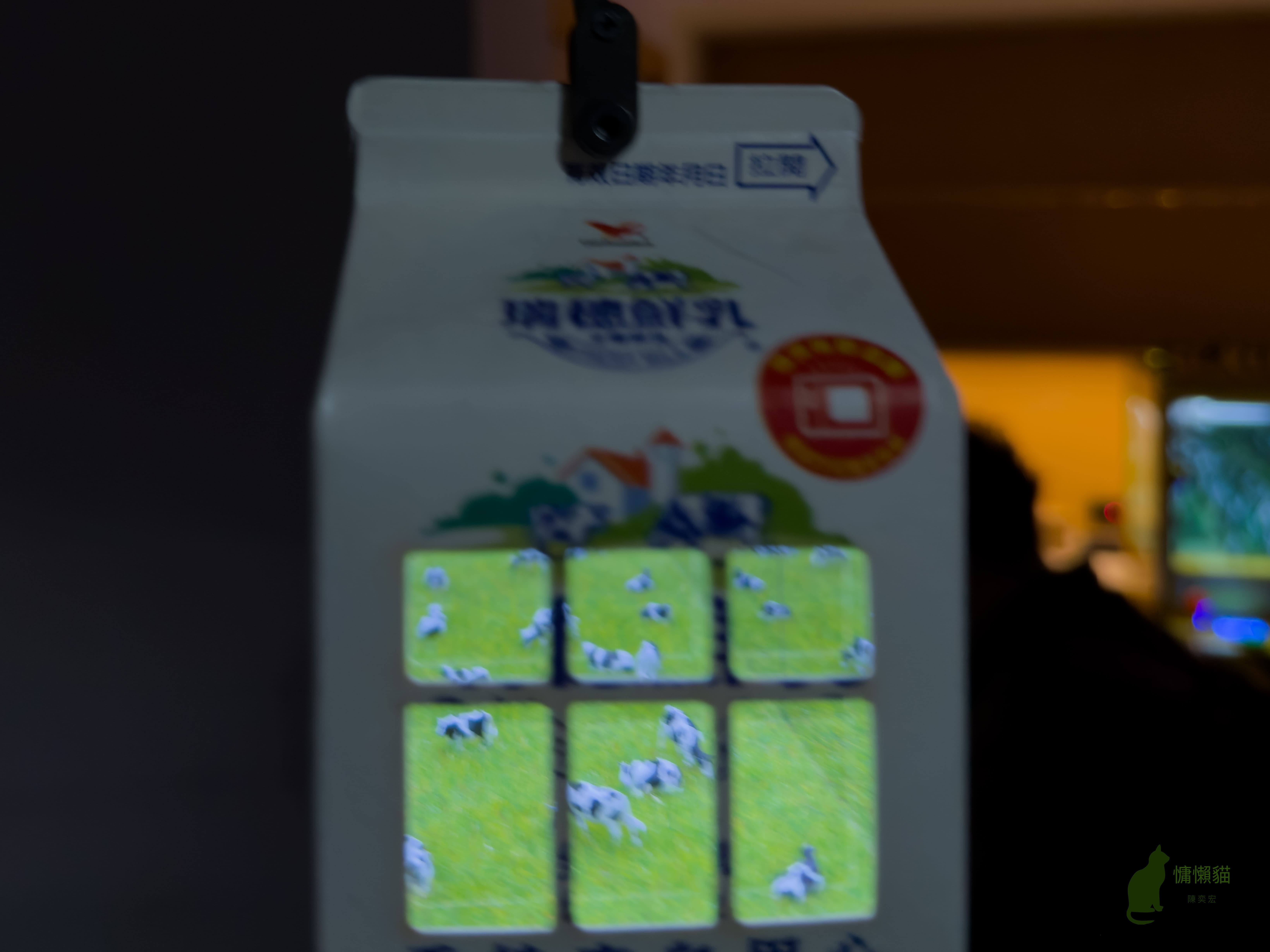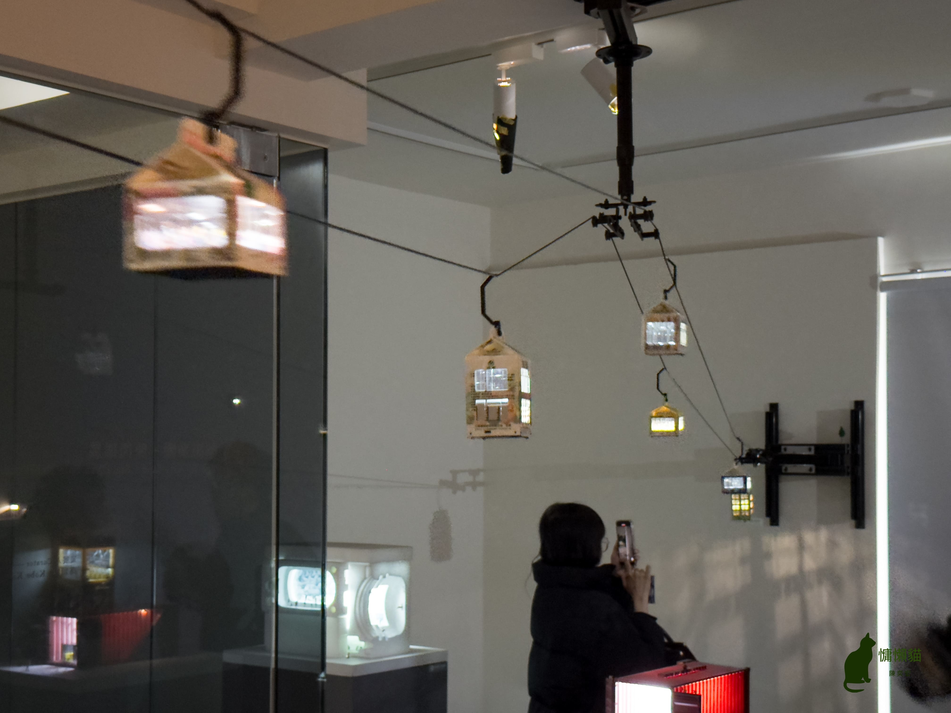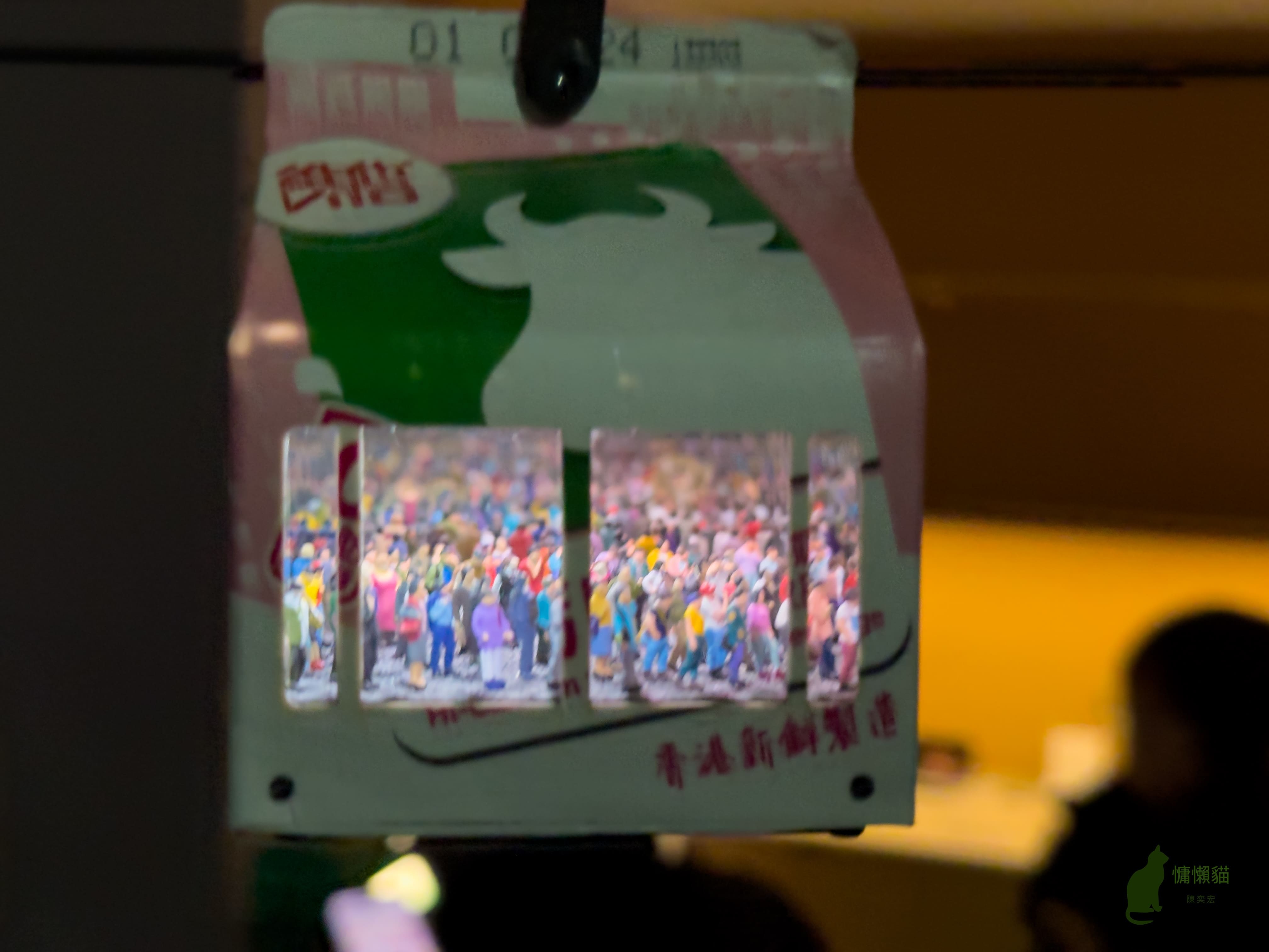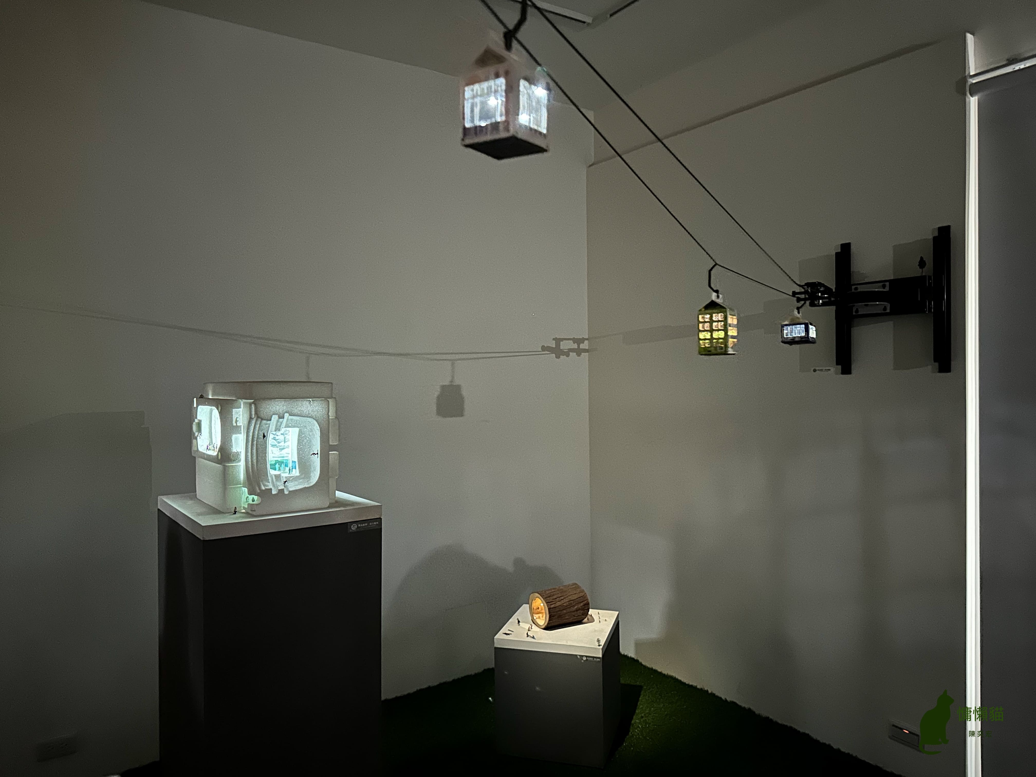 猶如高空纜車在展區上方來回穿梭的作品是這次陳閃的機動裝置系列作品《遊》。我們日常生活中常見的飲料盒成為一個小世界。當我看到瑞穗牛奶盒裡面居然有一群乳牛時,讓我想到林鳳營牛奶廣告裡張艾嘉在形如瑞穗牛奶「就像家裡真的養了一頭牛」,讓人不禁會心一笑。