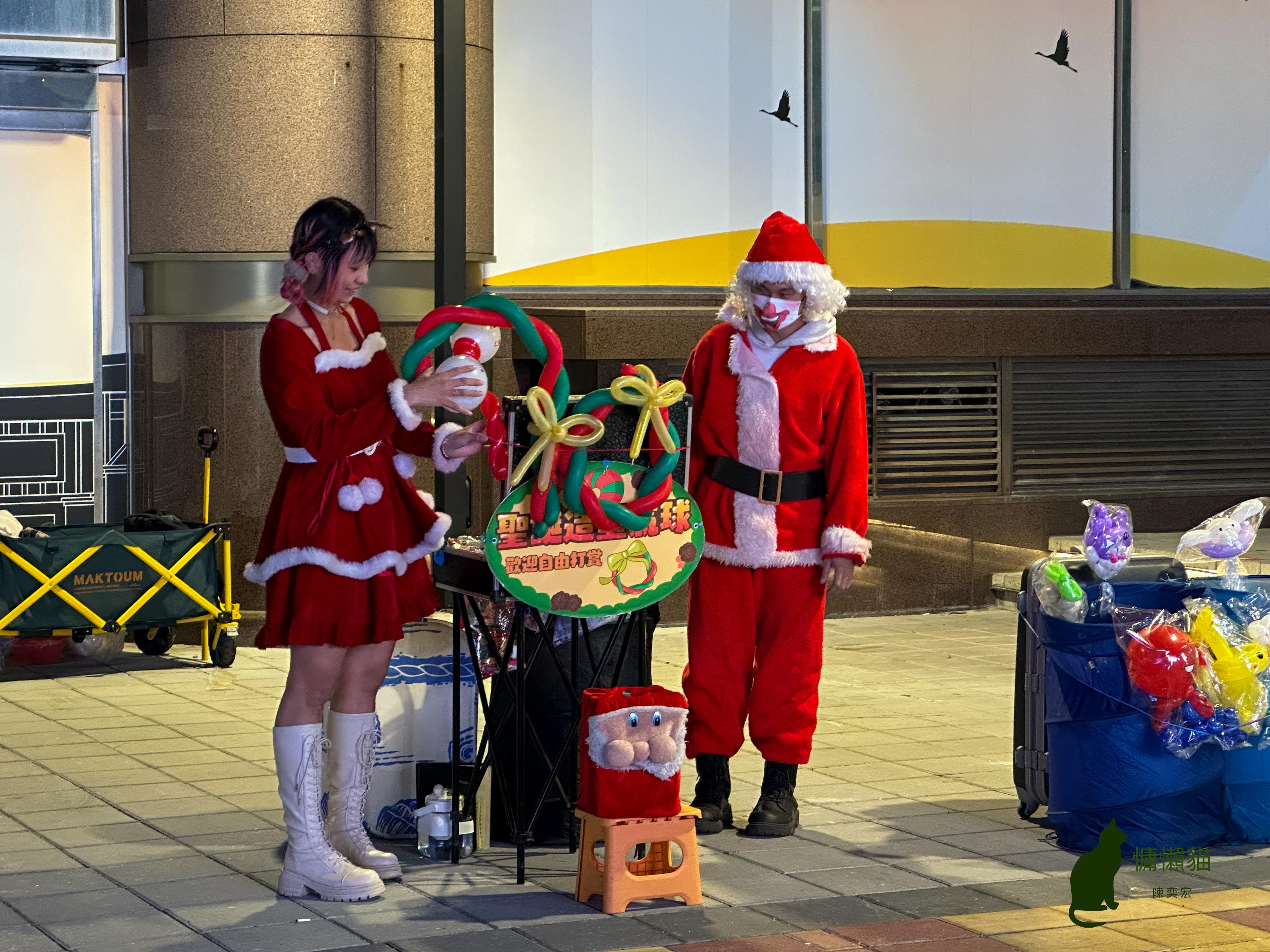 裝扮成聖誕老人的街頭藝人,在逛聖誕佈景時,幾乎每位小朋友都人手一個造氣球。