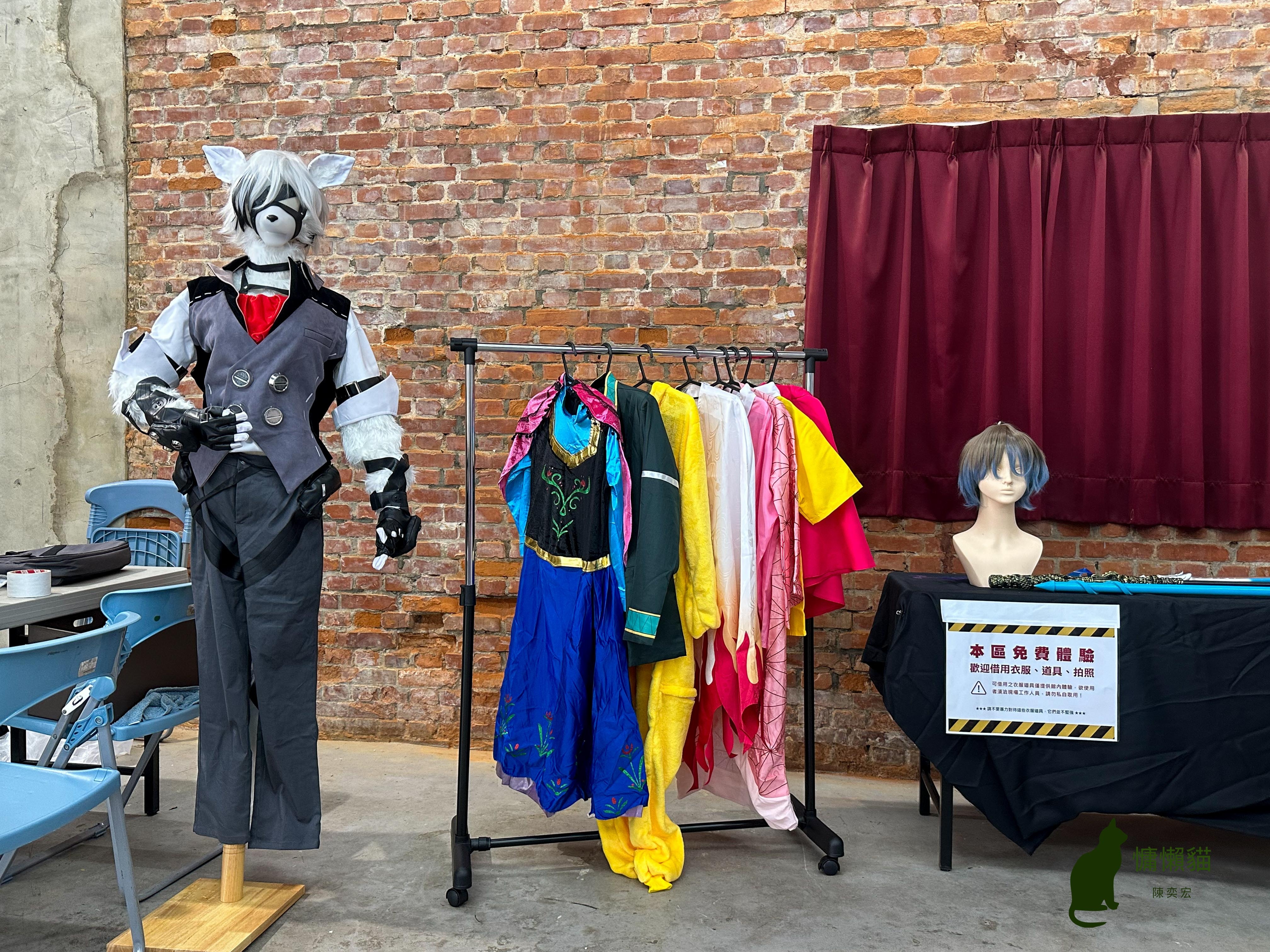 走進茉莉工坊,有夏侯橘助提供的1:1Cosplay道具展示,夏侯橘助曾經在文創plus臺南創意中心舉辦過「十二生肖COSPLAY創作展」,當時我還有去觀展,沒想到在這次ACG漫玩祭可以看到本人。主辦單位在現場也有提供Cosplay服飾和道具供民眾變裝拍照打卡。