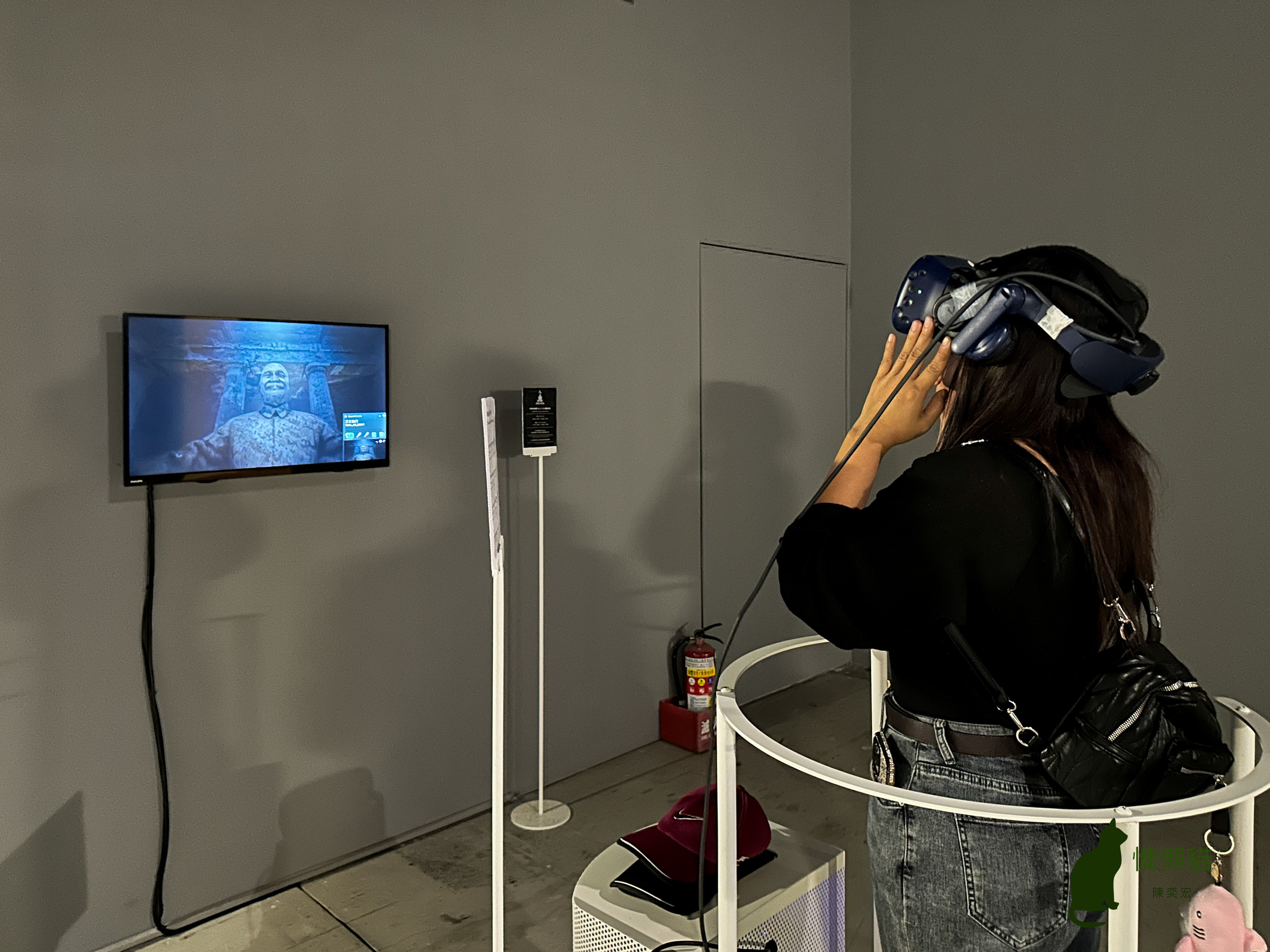 《徘徊的幽靈 No.2》藝術家藉由VR體驗裝置帶領民眾進入一處幽暗場域,隨著地板緩緩下降,我們看到一個森聳的人物坐像,威嚴的外貌令人不寒而慄,我當下看到雕像的瞬間,第一個聯想到蔣中正前總統在位期間的白色恐怖事件,在威權專制的操控之下,人民處於恐懼驚惶的環境之中,沒有任何力量可以與之抗衡,如今我們能生活在民主的國家中,不再擔心害怕,一言一行不再受人監控,是一件多麼幸福的事情。